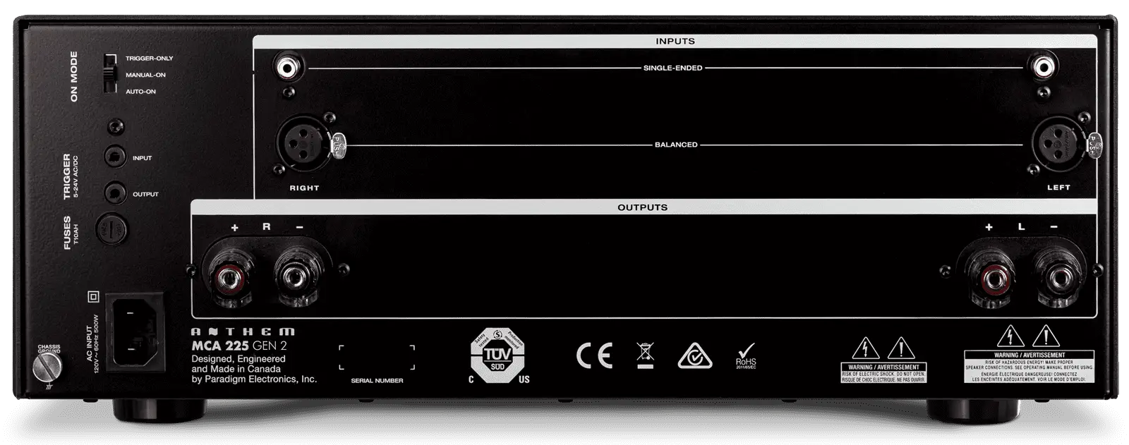 The MCA 525 GEN 2, MCA 325 GEN 2, and MCA 225 GEN 2, designed and Crafted in Canada, are like no other amplifiers in the world: custom low noise high-power toroidal transformers; high-current bipolar output transistors; high-quality filter capacitors; advanced power supply regulators; oversized aluminum heatsinks; custom-designed dual binding posts; and patented auto-on/off circuitry. Superior craftsmanship that is reflected in clean, clear, audiophile-quality sound from top to bottom of the frequency spectrum.