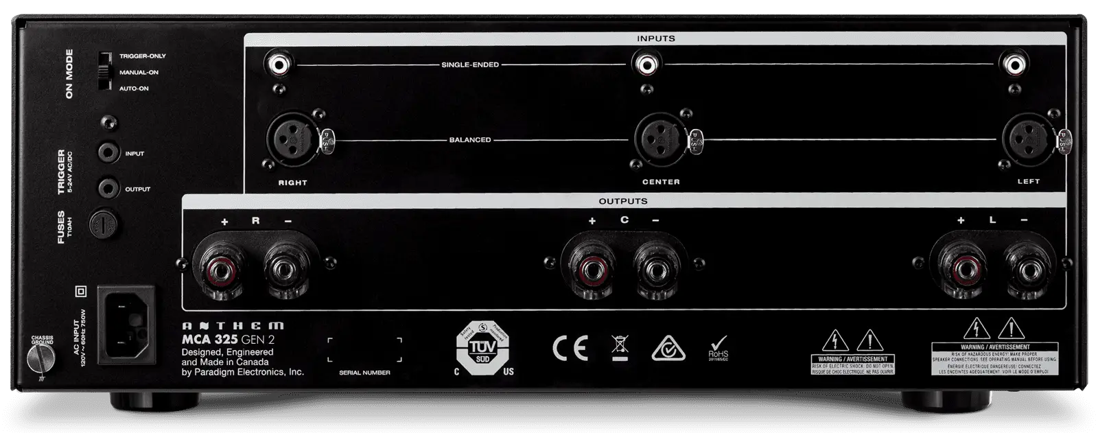 The MCA 525 GEN 2, MCA 325 GEN 2, and MCA 225 GEN 2, designed and Crafted in Canada, are like no other amplifiers in the world: custom low noise high-power toroidal transformers; high-current bipolar output transistors; high-quality filter capacitors; advanced power supply regulators; oversized aluminum heatsinks; custom-designed dual binding posts; and patented auto-on/off circuitry. Superior craftsmanship that is reflected in clean, clear, audiophile-quality sound from top to bottom of the frequency spectrum.