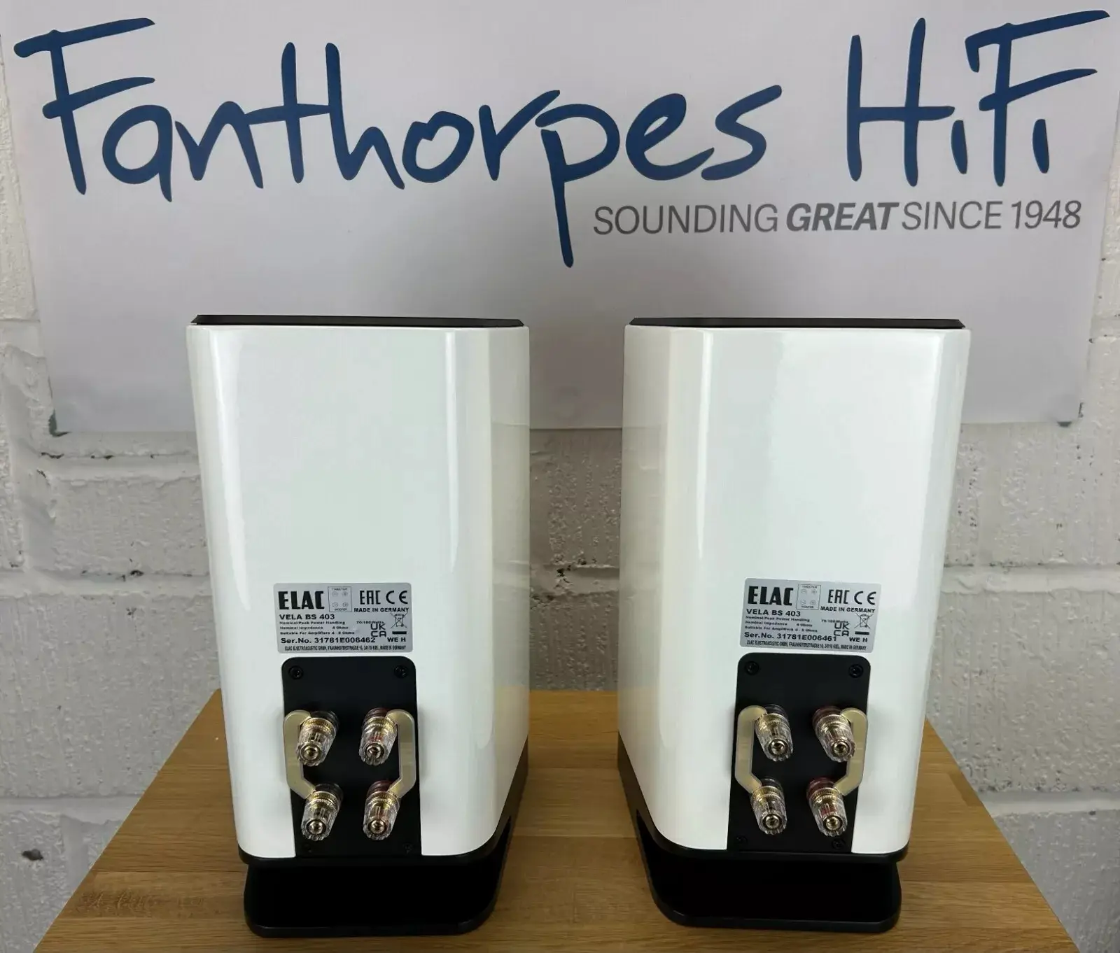 We have this preowned pair of Elac Vela BS 403 bookshelf speakers in gloss white.