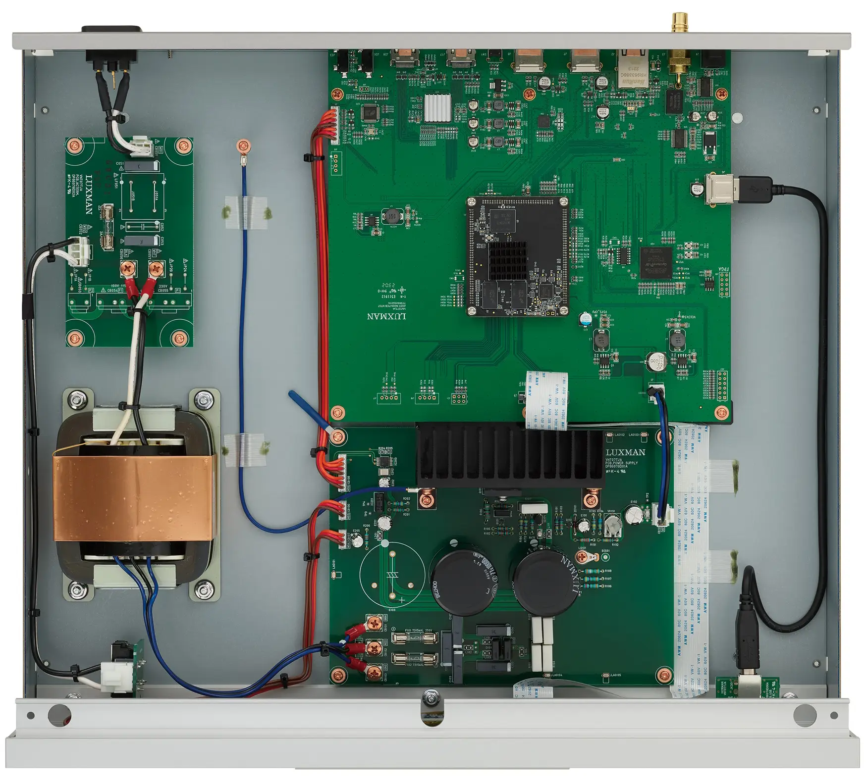At the heart of the NT07 is a robust power supply engineered to reduce noise and enhance stability. A large-capacity OI-type power transformer works in tandem with custom-made 10,000µF filter capacitors to deliver highly regulated and stable power. Luxman’s commitment to precision ensures the NT07 provides an audio experience free from power-related distortions.