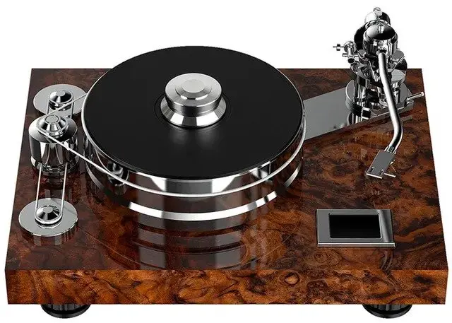 Magnetic feet decoupled from the chassis surface, Sorbothane 'pillows' and a floating-magnetic platter essentially guarantee a silent-running turntable. The Project Signature Turntable has a stylish 'fly-wheel' Belt Drive System ensures vibration-free running of the massive platter.