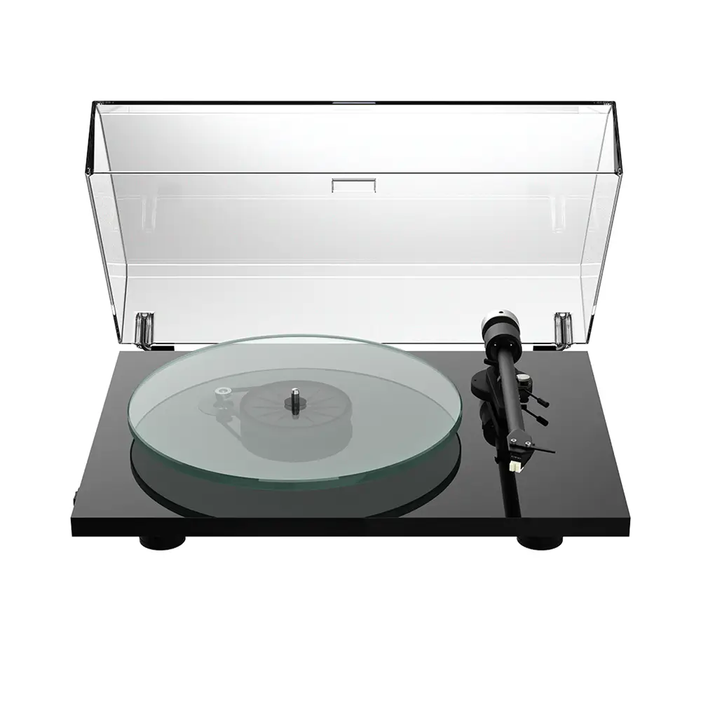 Mounted inside the plinth is a high-performance belt drive system featuring an electronically regulated, precision-speed AC motor, attached to Pro-Ject’s finely-engineered T-Line sub-platter, which is inserted into a stainless-steel axle/brass-bushing main bearing. The sub-platter drives the new heavy, zero-resonance glass platter with absolute stability, ensuring an ideal playback surface for vinyl records. Speed change is handled by a rocker switch for convenient switching between 33 and 45rpm.