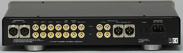 The Sugden Masterclass LA-4 pre-amplifier has provision for stereo pairs of balanced inputs, four single ended RCA (phono) inputs, a By-Pass input, Input and output recording facility, two main pre-amp outputs and a balanced output.
