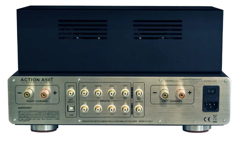 The Synthesis A50 Taurus is the middle model in the high-end Action series of integrated amplifiers. It's a 50W stereo tube amplifier that incorporates four KT88 valves into its sleek design. This beautiful amplifier also includes an onboard 24-bit / 192kHz Wolfson DAC for added convenience alongside a listening experience like no other.