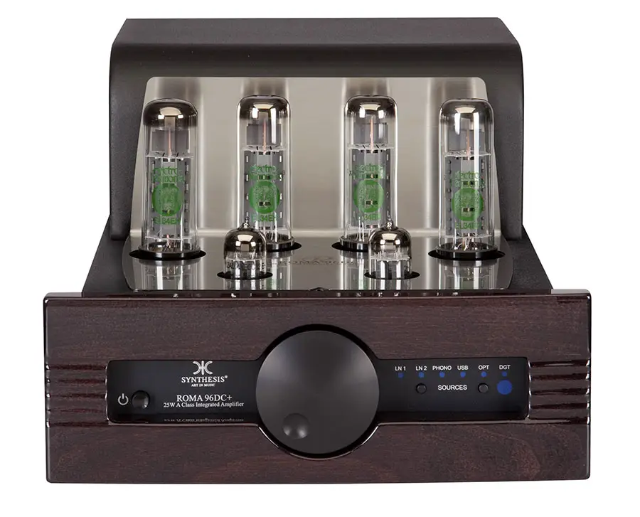 The Synthesis Roma 96DC+ is a 25W Class A stereo integrated amplifier, utilising four high-quality EL34 and two ECC82 valves in the design. Featuring a variety of digital and analogue inputs, including a moving magnet phono stage; it is both a high-end performer and a wholly convenient solution for music lovers.